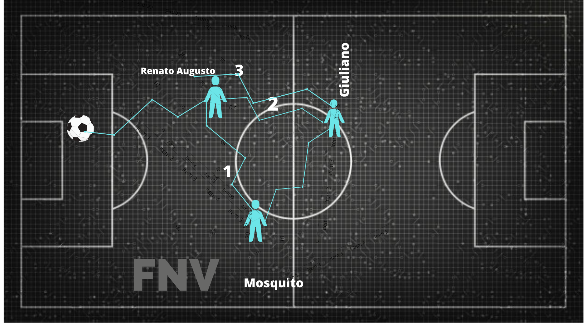 Ainda na partida contra o time cearense, foi possível ver como os dois conseguem manter equilíbrio nas jogadas, no passe. O camisa 11 consegue deixar facilmente Augusto de cara pro gol. Giuliano, que recebeu a bola de Mosquito, conseguiu lançar em um passe curto para o camisa 8, marcando um golaço.